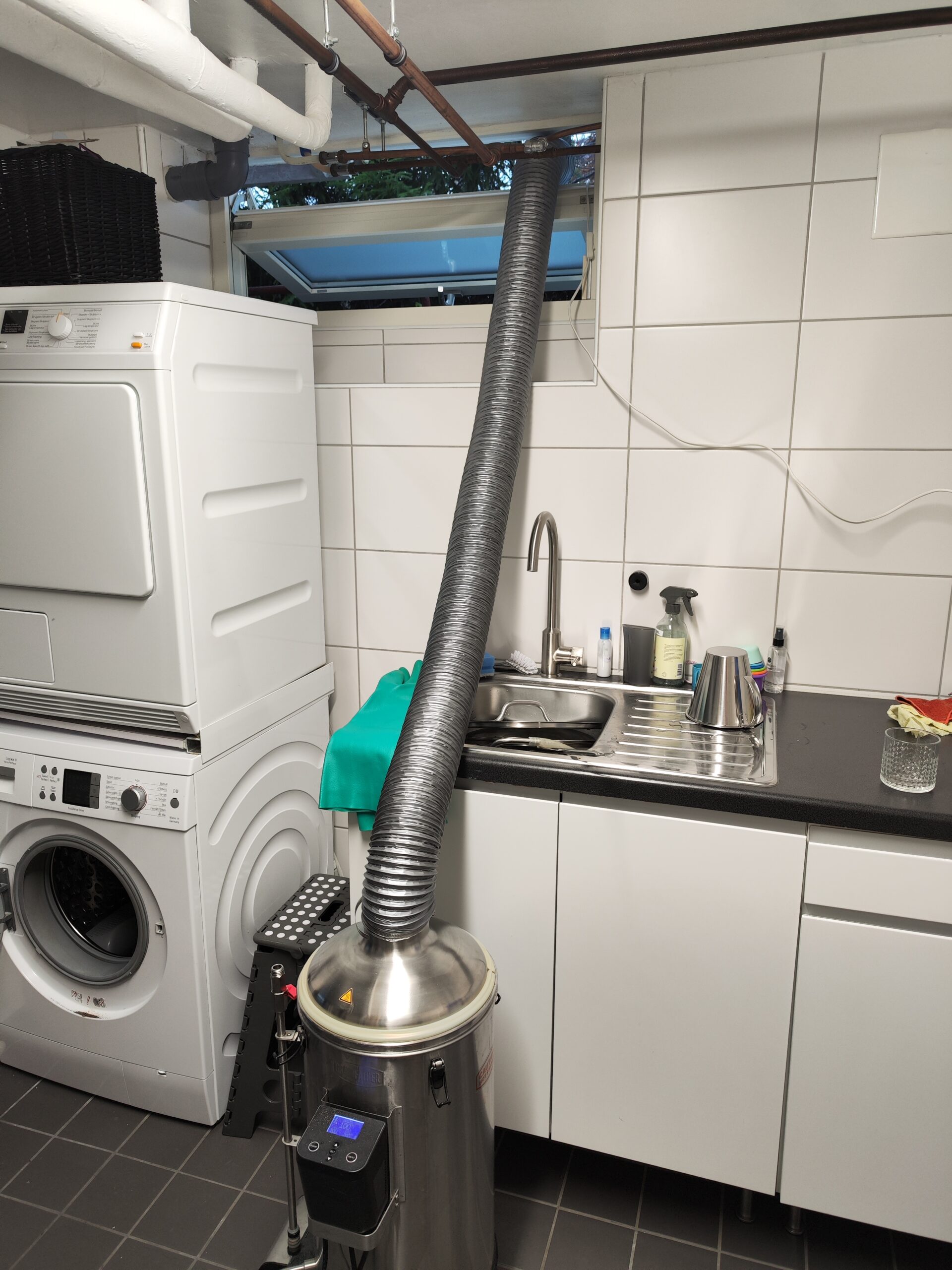 I figured that many other people should’ve faced my challenge and so I went to my sources on the wild internet and started studying what could be best solution for me. I finally found out that Braumeister has a hood that can be placed on top one of their homebrewing systems and it fitted my Grainfather homebrewing system nicely so after having this in my arsenal I bought a steam exhaust pipe and installed a fan on the other end having it sucking out the steam to make as efficient as possible. With the results in hand, it turned out great! I even got rid of the smell which is a plus sometimes, especially for the others who’re not brewing..
